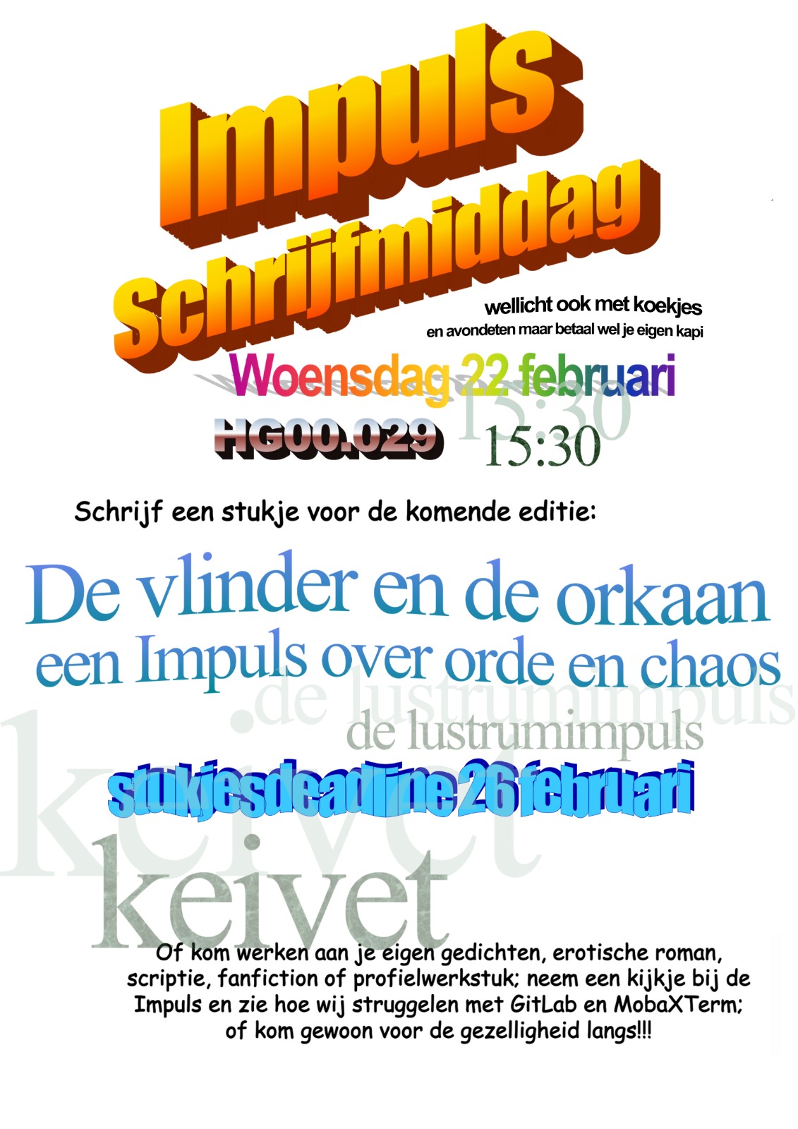 Daarom is er op woensdag 22 februari een heuse schrijfmiddag! Je kunt dan samen met de commissieleden leuke stukjes schrijven voor in de komende Impuls.Jullie zijn allemaal welkom in HG00.029, vanaf het vierde blok (15:30).
